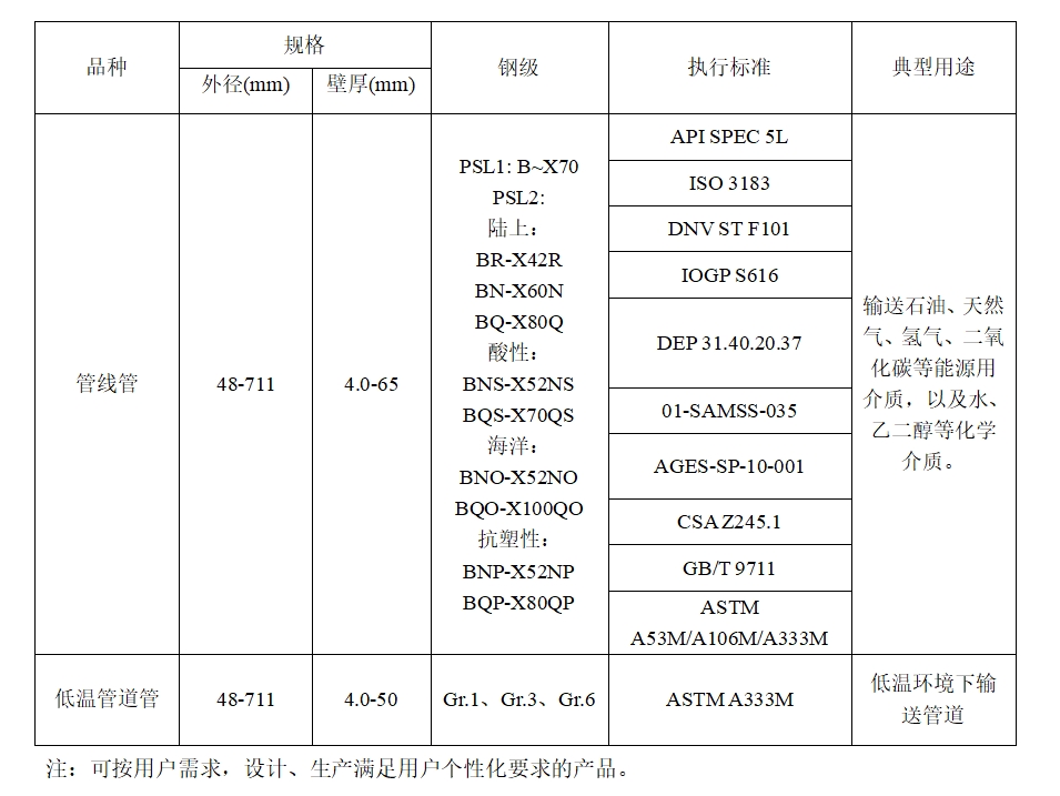 用于石油、天然气工业中的气、水、油输送。我拼搏网页版登录入口已具备高强管线管、耐低温管线管、耐高温管线管、抗腐蚀管线管、海洋管线管、抗塑性变形管线管、输氢管线管、输CO2管线管等多用途、高档次产品的制造能力,可满足陆上环境、海洋环境、抗H2S腐蚀、抗CO2腐蚀、绕管铺设等多种环境的要求。钢级最高分别可以达:强度级别最高X100Q,抗H2S腐蚀最高X70QS,海洋环境最高X100QO,抗塑性变形最该X80QP。管径范围:48~711mm。