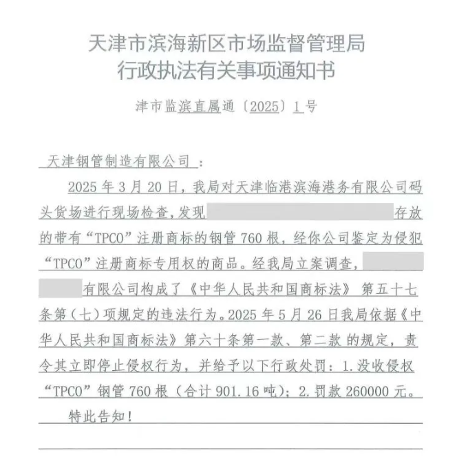 滨海新区市场监督管理局经各方调查后固定证据并认定责任人,依法对A拼搏网页版登录入口作出没收全部侵权钢管、罚款26万元等处罚,并将B拼搏网页版登录入口违法线索移交沧州市市场监管部门。